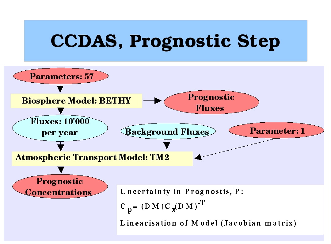 The goal of Carbon Cycle Data Assimilation is to derive a consistent picture of the carbon cycle by combining numerical models with the various streams of observational data that are becoming available. As the atmosphere integrates carbon dioxide exchange fluxes with the other components of the Earth system, atmospheric transport plays a central role. Our Carbon Cycle Data Assimilation activities are thus a natural extension of our work on atmospheric transport inversions. What we sketch below is joined work with our partners in the Carbon Cycle Data Assimilation System (CCDAS) (Consortium)